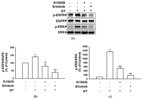 Effects of inhibitors on the gintonin-induced phosphorylation of proteins in HaCaT cells. Cells were serum-starved for 4 h and then incubated with serum-free medium containing gintonin (GT, 10 μg/mL) for 30 min in the presence or absence of lysophosphatidic acid (LPA) receptor inhibitor Ki16425 (10 μM) and epidermal growth factor (EGF) receptor inhibitor erlotinib (0.5 μM). Cell lysates were immunoblotted using corresponding antibodies. (a) The representative images of immunoblotting. (b,c) Statistical graphs based on panel (a). Each graph is expressed as a percentage of untreated control cells. Data are presented as means ± S.E.M. (n = 4); *** p < 0.001 vs. untreated control cells; ## p < 0.01; ### p < 0.001 vs. GT 10 μg/mL alone. p-EGFR, phospho-EGF receptor; p-ERK, extracellular signal-regulated kinase.