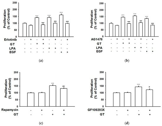 Effect of inhibitors on the proliferation of HaCaT cells. Cells were incubated in serum-free medium with gintonin (GT, 10 μg/mL), lysophosphatidic acid (LPA, 10 μM), or epidermal growth factor (EGF, 4 ng/mL) in the presence or absence of inhibitors for 24 h. Then, a water-soluble tetrazolium formazan (WST)-based assay was performed. Inhibitors used were EGF receptor inhibitor erlotinib (0.5 μM) (a), AG1478 (0.5 μM) (b), mTOR inhibitor rapamycin (100 nM) (c), or protein kinase C inhibitor GF109203X (1 μM) (d). LPA and EGF were used as positive controls. The response of untreated cell was considered to be 100%. Data are presented as means ± S.E.M. (n = 6); *** p < 0.001 vs. untreated control cell; # p < 0.05; ## p < 0.01; ### p < 0.001 vs. GT, LPA, or EGF alone. mTOR, mammalian target of the rapamycin.