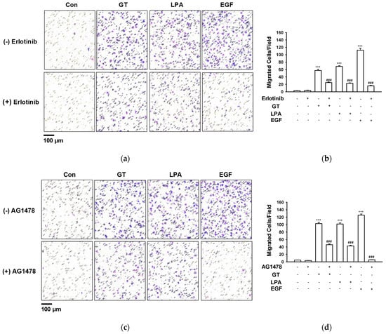 Effect of epidermal growth factor (EGF) receptor inhibitors on the migration of HaCaT cells. (a,c) Representative images of migrated cells. Cells were pretreated in serum-free medium for 1 h with EGF receptor inhibitor erlotinib (0.5 μM) (a) or AG1478 (0.5 μM) (c) in the modified Boyden chamber and then cells were incubated with gintonin (GT, 10 μg/mL), lysophosphatidic acid (LPA, 10 μM), or EGF (4 ng/mL) in the presence or absence of inhibitors for 2 h. The migration of cells was analyzed via the modified Boyden chamber assay as described in the Section 4. LPA and EGF were used as positive controls. Migrated cells are shown as violet spots. Scale bar: 100 μm. (b,d) Statistical graphs obtained from panel (a,c), respectively. Data represent the means ± S.E.M. (n = 16); *** p < 0.001 vs. untreated cells (Con); ### p < 0.001 vs. GT, LPA, or EGF alone.