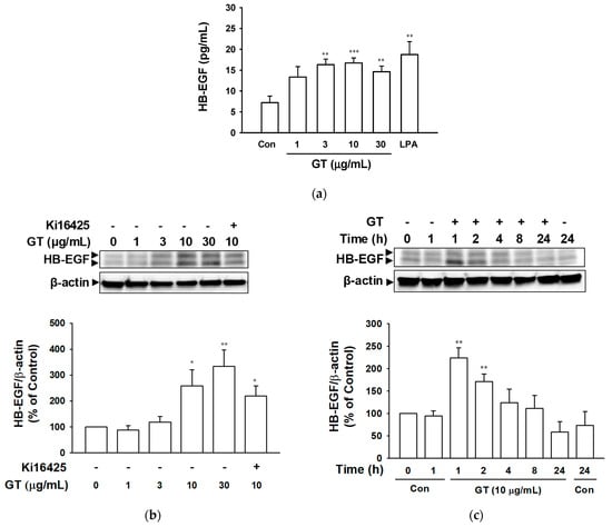 HB-EGF is known as one of the potent ligands of EGF receptors [,,,]. Thus, we hypothesized that the delayed and sustained EGF receptor activation pattern induced by gintonin might be related to the gintonin-mediated release of other EGF receptor ligands, including HB-EGF. To determine the release and expression of HB-EGF in HaCaT cells exposed to gintonin, we treated HaCaT cells with gintonin and analyzed the release of HB-EGF in a conditioned medium after cell culture and the expression of HB-EGF in cells using an enzyme-linked immunosorbent assay (ELISA) and immunoblotting, respectively. Gintonin significantly increased HB-EGF release in the concentration range of 3 to 30 μg/mL for 24 h (Figure 5a). LPA (10 μM) also increased HB-EGF release. In addition, gintonin increased the expression of HB-EGF in cells in the concentration range of 3 to 30 μg/mL in a dose-dependent manner, which was significant at 10 and 30 μg/mL (Figure 5b). In HaCaT cells incubated with gintonin (10 μg/mL) for 1 to 24 h, the expression level of HB-EGF showed a significant increase after 1 and 2 h of incubation and then gradually decreased in a time-dependent manner until 24 h of incubation (Figure 5c).