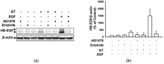 Effect of EGF receptor inhibitors on gintonin-induced HB-EGF expression in HaCaT cells. Cells were incubated with serum-free medium containing gintonin (GT, 10 μg/mL) or epidermal growth factor (EGF, 4 ng/mL) for 60 min in the presence or absence of EGF receptor inhibitor erlotinib (0.5 μM) or AG1478 (0.5 μM). Then, cell lysates were immunoblotted for the detection of HB-EGF expression. (a) Representative images of immunoblotting. (b) Statistical graph obtained from panel (a). Graph is expressed as a percentage of untreated control cells. Data are presented as means ± S.E.M. (n = 4); * p < 0.05; ** p < 0.01 vs. untreated control cells; # p < 0.05 vs. GT or EGF alone. HB-EGF, heparin-binding EGF-like growth factor.