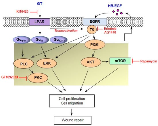 Recently, we identified gintonin, an LPA receptor ligand derived from ginseng. Gintonin is a glycoprotein that exerts various physiological and pharmacological effects through LPA receptors, such as LPA []. Previous studies have demonstrated that gintonin can induce intracellular calcium transients, cell proliferation, and migration in several cell types, such as HUVEC, human hair follicle cells, and dermal fibroblasts [,,]. We found that gintonin enhanced cell proliferation, migration, vascular endothelial growth factor (VEGF) release, and wound closure in in vitro assays using HaCaT human skin keratinocytes, which are commonly used to study skin wound healing-related keratinocyte activities [,], and that it promoted in vivo wound healing in a wounded mouse tail []. Moreover, gintonin-enhanced cell proliferation, migration, and VEGF release were markedly blocked via treatment with a LPA inhibitor []. Furthermore, extracellular signal-regulated kinase (ERK), calcium chelators, phospholipase C (PLC), and VEGF receptor inhibitors attenuate gintonin-enhanced cell proliferation []. These findings indicate that gintonin promotes wound healing by activating LPA receptor–VEGF release-mediated downstream signaling pathways []. LPA transactivates the EGF receptor [,], and HB-EGF binds to the EGF receptor to activate the proliferation and migration of keratinocytes [,,,,]. Therefore, the LPA receptor ligand gintonin may transactivate the EGF receptor and still function through other mechanisms, including the involvement of the EGF receptor and HB-EGF in keratinocyte proliferation and migration.