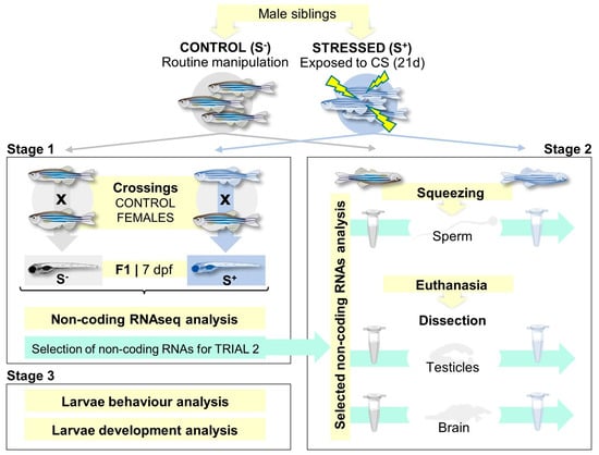 We conducted the experiment in three stages (Figure 1). The aim of Stage 1 was to discover altered noncoding RNAs in the 7 dpf progenies derived from chronically stressed males crossed with control females. Stage 2 aimed to evaluate the resulting noncoding RNA profile in the following paternal biological samples: sperm, brain, and testicles. Stage 3 aimed to explore the physiological changes linked to the altered molecules found between the control- and stress-derived larvae.