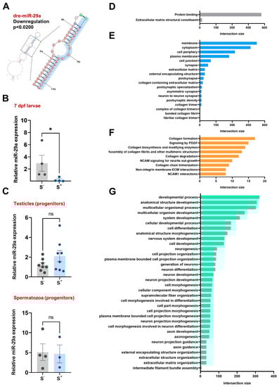 RNA-seq analyses focused on small RNAs populations in S− and S+ 7 dpf larvae revealed (A) miR-29a as the unique differentially expressed small RNA. (B) validation of miR-29a downregulation with qPCR experiments. (C) miR-29a levels in the testicles (n = 8) and spermatozoa (n = 4 pools) samples from the chronically stressed male progenitors. Top entries reported by g:Profiler analysis of the miR-29a targets included in the TargetFishScan database for (D) molecular function, (E) cellular component, (F) biological pathways (Reactome database), and (G) biological processes. S−: larvae resulting from crossings involving control progenitors. S+: larvae from crossings involving control females and chronically stressed males. Data in (B,C) are presented as mean ± SEM (* p < 0.0500; ns: not statistically significant differences).