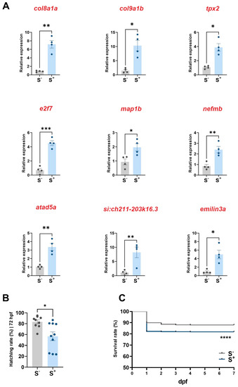 (A) relative gene expression (normalized with actb2) of nine targets of miR-29a in 7 dpf larvae (n = 4). (B) hatching rate at 72 h postfertilization (hpf; n = 9–10). (C) Kaplan–Meier survival curves (1–7 dpf) for the two experimental groups. S−: larvae resulting from crossings involving control progenitors. S+: larvae from crossings involving control females and chronically stressed males. Data are presented as mean ± SEM (* p < 0.0500; ** p < 0.0100; *** p < 0.0010; and **** p < 0.00010).