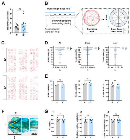 Brain and behavioral analyses. (A) relative miR-29a expression in paternal brains (n = 9). (B) diagram representing the novel tank test (NTT) used in the experiment. Example of a track reported by Tracker software 6.0.8 version (red line). Virtual grid (16 zones) used for movement quantification in terms of zone exploration. (C) evaluated tracks from both groups. (D) histograms showing scored areas in both groups studying the total areas (all), perimetral zones (outer), and central zones (inner). (E) mean values for the scoring areas for the biological replicates (n = 3). (F) diagram showing the three measurements evaluated in the cranioencephalic region of the larvae: (1) Meckel’s-palatoquadrate (M–PQ) angle, (2) ceratohyal cartilage length, and (3) lower jaw length. (G) comparisons for M–PQ angle, ceratohyal cartilage length (mm), lower jaw length (mm). S−: larvae resulting from crossings involving control progenitors. S+: larvae from crossings involving control females and chronically stressed males. Data are presented as mean ± SEM (ns: not statistically significant differences).