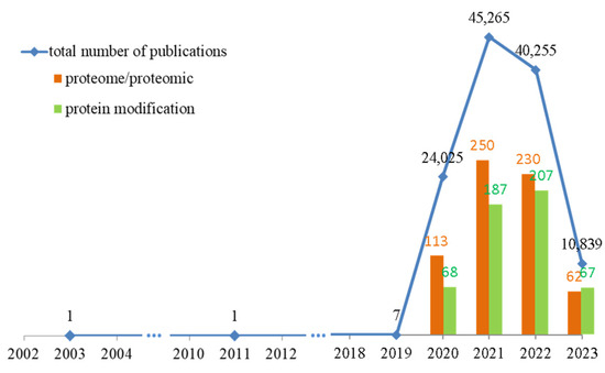 The number of published studies on changes in patients’ bodies caused by SARS-CoV-2 infection over the past 10 years, with emphasis on proteomics studies and articles containing analyses of protein modifications. Data obtained from Web of Science Core Collection (accessed on 26 June 2023) [3].