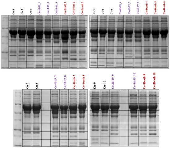 Proteomics analyses revealed differences in protein expression among the three study groups: COVID-19 survivors (COVID-19), COVID-19 deceased patients (CovDeath), and healthy donors who were set as the control group (Ctr). Below are described point by point the most important statistically significant results, including those resulting from gel profiling, PCA statistical analysis, as well as levels of individual top-altered proteins and their modifications by lipid peroxidation products. Differences between all studied groups were already observed during sample preparation, as the lower parts of the SDS-PAGE gels varied in the distribution of bands between samples (Figure 2).