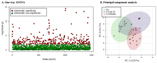 The results of statistical analysis of protein level quantified in plasma from healthy donors (Ctr, n = 10), COVID-19 patients (COVID-19—surviving patients, n = 10), and CovDeath (COVID-19 deceased patients, n = 10). (A) One-way ANOVA showing p distribution within all data and (B) results of principal-component analysis (PCA).