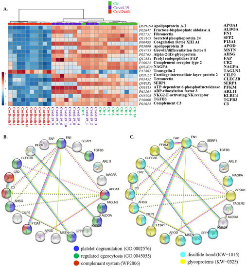 (A) Heatmap and clustering for the top 20 altered proteins from the plasma from healthy donors (Ctr, n = 10), COVID-19 patients (COVID-19—surviving patients, n = 10), and CovDeath (COVID-19 deceased patients, n = 10). Protein expression levels (log transformed) were scaled to the row mean. The color key relates the heatmap colors to the standard score (z-score), which is the deviation from the row mean in units of standard deviation above or below the mean. (B) The main biological pathways in which proteins selected in the heatmap participate and (C) structural modifications of these proteins. Data analyzed using STRING.11.5. Keywords used (KW): (KW-0325) protein containing one or more covalently linked carbohydrates of various types, i.e., from monosaccharides to branched polysaccharides, including glycosylphosphatidylinositol-inositol (GPI) and glycosaminoglycans (GAG); (KW-1015) protein which is modified by the formation of a bond between the thiol groups of two peptidyl-cysteine residues.