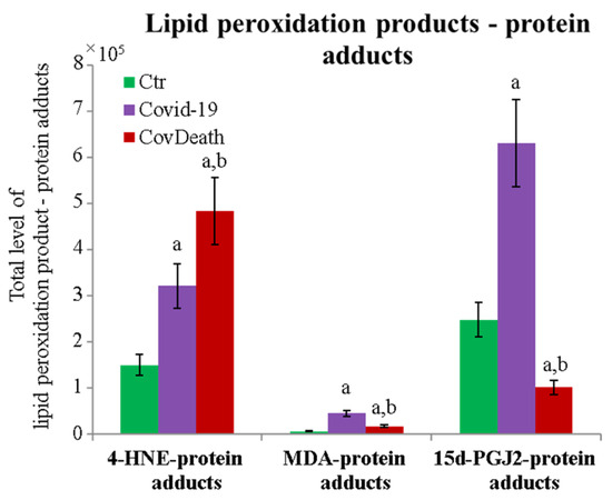 Total level of protein modifications by lipid peroxidation products 4-hydroxynonenal (4-HNE), malondialdehyde (MDA), and 15-deoxy-12,14-prostaglandin J2 (15d-PGJ2) in plasma from healthy donors (Ctr, n = 10), COVID-19 patients (COVID-19—surviving patients, n = 10), and CovDeath (COVID-19 deceased patients, n = 10). The levels of lipid peroxidation product–protein adducts were estimated based on the peak intensity of modified peptides. Mean values ± SD are presented. a statistically significant differences vs. Ctr group, p < 0.05; b statistically significant differences vs. COVID-19 group, p < 0.05.