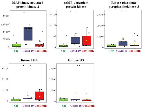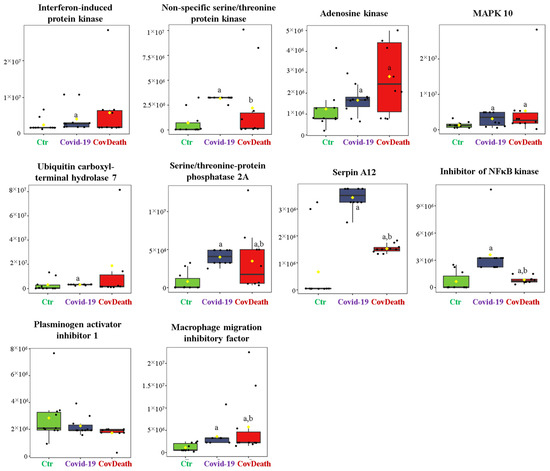 The dominant 4-HNE-modified proteins were serpin A12 (Q8IW75), inhibitor of NF-κB kinase (O15111), macrophage migration inhibitory factor (P14174), and kinases: adenosine kinase (P55263), MAPK 10 (P53779), and non-specific serine/threonine protein kinase (Q9Y6B5). All proteins modified by 4-HNE are shown in Figure 6. For protein adducts with MDA, the highest level was observed in COVID-19 surviving patients, which was seven times higher than the Ctr group. In the CovDeath group, the level of MDA–protein adducts was about 2.5 times higher than the Ctr group. This result was related to the increased levels of MDA adducts with kinases (cAMP-dependent protein kinase (P22612), ribose-phosphate pyrophosphokinase 3 (P21108), and MAP kinase-activated protein kinase 2 (P49137)), which were mainly observed in COVID-19 surviving patients. Histones H2A (Q8IUE6) and H3 (Q5TEC6) were also altered to an increased extent (Figure 7). Interestingly, although a 2.5-fold increase in 15d-PGJ2 protein adducts was observed in the COVID-19 surviving group, a decrease of up to 60% was observed in the COVID-19 deceased group (Figure 5). This was particularly true for proteins such as p53 (S5LQU3), collapsin response mediator protein 1 (CRMP1, X5DNI1), signal transducer and activator of transcription 3 (STAT 3, P40763), and apoptosis inhibitor 5 (API5, Q9BZZ5) (Figure 8).