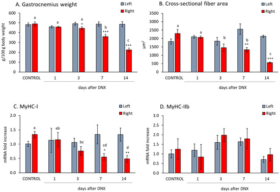 2.1. Denervation Effect on Gastrocnemius Muscle Atrophy and Myofiber Isoform Expression