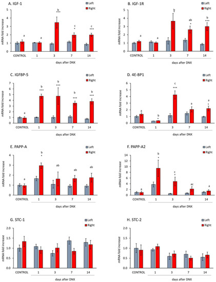 - Gosteli-Peter, M.A.; Winterhalter, K.H.; Schmid, C.; Froesch, E.R.; Zapf, J. Expression and regulation of insulin-like growth factor-I (IGF-I) and IGF-binding protein messenger ribonucleic acid levels in tissues of hypophysectomized rats infused with IGF-I and growth hormone. Endocrinology 1994, 135, 2558–2567. [Google Scholar] [CrossRef] [PubMed]