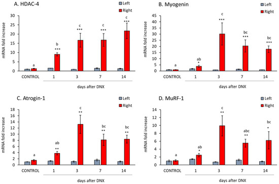 - Moresi, V.; Williams, A.H.; Meadows, E.; Flynn, J.M.; Potthoff, M.J.; McAnally, J.; Shelton, J.M.; Backs, J.; Klein, W.H.; Richardson, J.A.; et al. Myogenin and class II HDACs control neurogenic muscle atrophy by inducing E3 ubiquitin ligases. Cell 2010, 143, 35–45. [Google Scholar] [CrossRef] [PubMed]