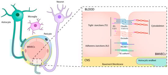 Schematic representation of the blood-brain barrier (BBB). It is located within the neurovascular unit (NVU) and constituted by endothelial cells interconnected by tight junctions (TJ) and adherens junctions (AJs), and neighboring cells, such as pericytes, astrocytes, neurons, and microglia. CNS: central nervous system; BMVECs: brain microvascular endothelial cells; ZO: zonula occludens; PECAM: Platelet endothelial cell adhesion molecule; VE-cadherin: vascular endothelial cadherin.