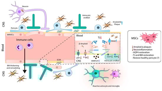 Blood-brain barrier (BBB) disruption in Alzheimer’s disease (AD) pathogenesis. The breakdown of the BBB in AD is characterized by a cascade of events, including loss of TJ integrity, disorganization of the basement membrane (BM) and extracellular matrix, pericyte degeneration and detachment, activation of glial cells, astrocyte depolarization, and alteration of BBB transporter expression (LRP1, P-gp, and GLUT1 are reduced, whereas RAGE expression is increased). These modifications may lead directly or indirectly to disturbed Amyloid β (Aβ) clearance in the neurovascular unit (NVU), contributing to further neuronal toxicity and AD pathogenesis. Treatment with MSCs restore BBB integrity by stabilizing TJ, BM, and extracellular matrix (ECM) remodeling, and reduces the neuroinflammation and Aβ accumulation. CNS: central nervous system; BMVECs: brain microvascular endothelial cells; BM: basement membrane; RAGE: receptor for advanced glycation end products; LRP1: Low density lipoprotein receptor-related protein 1; P-gp: permeability glycoprotein; GLUT1: glucose transporter 1; MMP: metalloproteinases; TJ: tight junctions; AQP: aquaporin. Blue and red arrows mean increase and reduction, respectively.