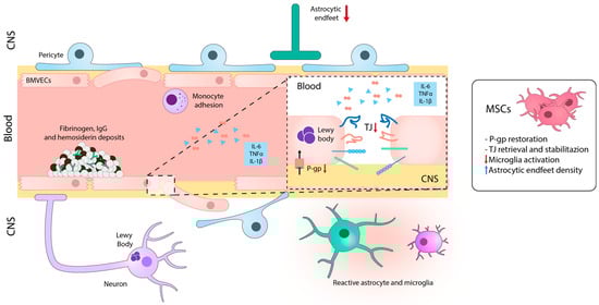 Schematic image illustrating blood-brain barrier dysfunction in PD. Alterations in BMVECs are characterized by decreased TJ and AJ proteins and disorganization of the basement membrane. In addition to the reduction in astrocytic end-feet and pericyte loss, these changes can lead to BBB breakdown and subsequent accumulation of fibrinogen, thrombin, and hemosiderin, which together with α-synuclein can activate glial cells and injure dopaminergic neurons. Treatment with MSCs recovers BBB integrity by stabilizing the TJ structure and decreases the production and accumulation of neuroinflammatory and neurotoxic mediators. CNS: central nervous system; BMVECs: brain microvascular endothelial cells; TJ: tight junctions; P-gp: permeability glycoprotein; Ig: immunoglobulin. Blue and red arrows mean increase and reduction, respectively.