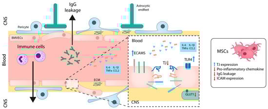 The disruption of the BBB in MS allows immune cells to infiltrate into the CNS, contributing to the pathogenesis of MS, as previously mentioned. In vitro studies using a BBB model exposed to TNF-α have shown that treatment with embryonic MSCs modulates barrier permeability, increases the expression of TJ proteins, and decreases the expression of pro-inflammatory chemokines like CCL2 and CXCL12 [] (Figure 4). In vivo studies have also demonstrated that co-administration of MSCs expressing IFN-β along with minocycline tames the disruption of the Blood-Spinal Cord Barrier (the functional equivalent of the BBB in the spinal cord) []. Recent studies in the MS preclinical model (experimental autoimmune encephalomyelitis) have further shown that MSC transplantation reduced BBB disruption, as evidenced by reduced IgG leakage. Additionally, MSC transplantation led to the adequate expression of TJ-proteins occluding and ZO-1 in BMVECs and the restoration of AQP4 levels in astrocytes [].