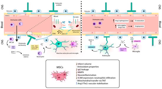 Scheme illustrating pathophysiology of blood-brain barrier permeability during stroke. Left panel, hyperacute and acute stages are characterized by endothelial cell destabilization and BBB disruption, edema, peripheral immune infiltration, and glial immune activation. Right panel, subacute and chronic stages are involved in the recovery phase. This is characterized by vascular organization, restoration of BBB integrity, and by anti-inflammatory and reparative immune activities. Treatment with MSCs during the hyperacute and acute phases reduces cytotoxic damage by the production of neurotrophic factors, by the decrease in the pro-inflammatory mediators and immune infiltration and by the recovery of BBB integrity. During the subacute and chronic stages, MSC treatment may collaborate with the endogenous mechanisms of recovery by keeping immunomodulatory properties and by favoring vascular stabilization. CNS: central nervous system; ECM: extracellular matrix; BMVECs: brain microvascular endothelial cells; ECAMs: endothelial cell adhesion molecules; NK: natural killer; MMP: metalloproteinases; VEGF: vascular endothelial growth factor; TJ: tight junctions; Ang: angiopoietin; Tie2: tyrosine kinase receptor. Blue and red arrows mean increase and reduction, respectively.