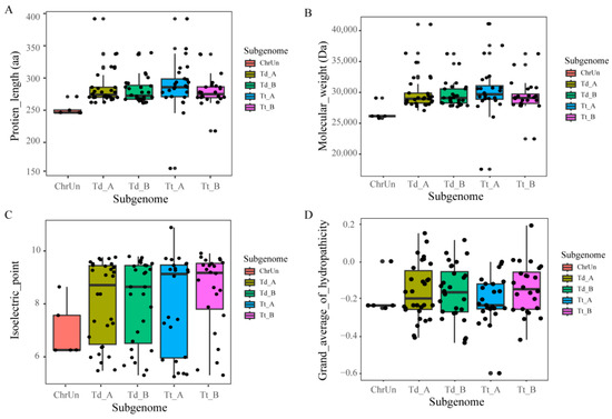 Statistics and analysis of expansin gene sequences on subgenomes. (A) The protein sequence length of expansin genes family in Triticum dicoccoides and Triticum turgidum; (B) the molecular weight of expansin genes family; (C) the isoelectric point of expansin genes family; (D) the grand average of hydropathicity in expansin genes family, the Td-A and Td-B shows subgenome A and B in wild emmer wheat, Tt-A and Tt-B shows subgenome A and B in durum wheat, ChrUn show unplaced scaffolds.