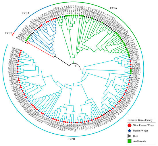 To know the phylogenetic relationship of expansin in this study, the evolutionary tree that also joined expansins of Arabidopsis and rice was constructed, including 63 and 49 wild emmer wheat (TdEXPs) and durum wheat (TtEXPs), respectively, 34 Arabidopsis (AtEXPs), and 38 rice (OsEXPs) [22]. In Figure 2, the expansin proteins were classified into four subfamilies, EXPA, EXPB, EXLA, and EXLB. Among them, EXPB subfamily member 114, including 55 TdEXPs, 45 TtEXPs, 5 AtEXPBs, and 9 OsEXPBs, followed by EXPA subfamily member 48, including 24 AtEXPAs and 24 OsEXPAs, among EXLA subfamily members 20, 8 TdEXPs, 4 TtEXPs, 3 AtEXLAs, and 5 OsEXLAs; there were not any genes for TdEXP and TtEXP found in the EXLB subfamily members.
