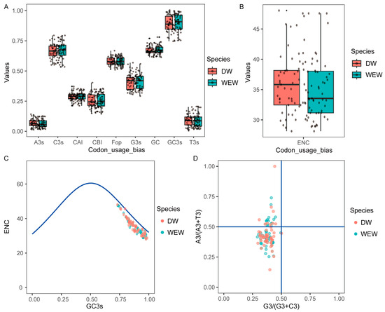The codon usage bias analyses of expansin gene family in wild emmer wheat (WEW) and durum wheat (DW). (A) Characterization of codon usage bias; (B) ENC analysis; (C) ENC-plot curves of the codons, the blue solid curve shows the expected positions of the genes which are determined only by GCs; (D) PR2-plots analysis, blue lines were x = 0.5 and y = 0.5.