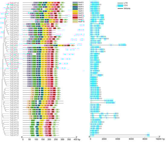 In durum wheat (Figure 5), the number of exons was discovered to be from 1 to 11 (except 7 and 9). There was one exon (about 2.04%) in TtEXP12, TtEXP15, TtEXP29, genes with two exons for about 14.29%, three exons for about 28.57%, four exons for about 38.78%, five and six exons for about 6.12%, and TtEXP12 and TtEXP15 had eight and eleven exons (about 2.04%). Analysis of the MEME motifs (1 to 10) in the protein sequences showed that motif 9 was detected in only 13 coding proteins (26.53%), motif 5 was found in only 30 coding proteins (61.22%), motif 6 was found in only 40 coding proteins (81.63%), motif 7 was found in only 44 coding proteins (89.80%), motifs 1, 2, and 3 were found in 48 coding proteins (95.92%), and motif 4 and motif 9 were found in 47 coding proteins (97.96%). Most of the relatively conserved motif units may be present in the expansin family.