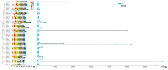 To better understand the similarities, differences, and distribution of gene structure and protein motifs, the gene structure and conserved motifs were mapped with TBtools. In wild emmer wheat (Figure 4), the numbers of exon–intron were found to be between 1 and 5 in exons for the expansin family with about 7.94% of genes that included 1 exon, 14.29% of those with 2 exons, 38.10% of those with 3 exons, 34.92% of those with 4 exons, and 4.76% of those with 5 exons. Further analysis of the MEME motif constructs (1 to 10) for expansin protein sequences showed that motif 10 was identified in only 15 encoded proteins, motif 6 was identified in only 23 coding proteins, motif 4 was found in 61, and motif 1 was unidentified in 62. However, motif 2, which exhibits the more abundant and highly conserved motifs, are recognized in all expansin families.