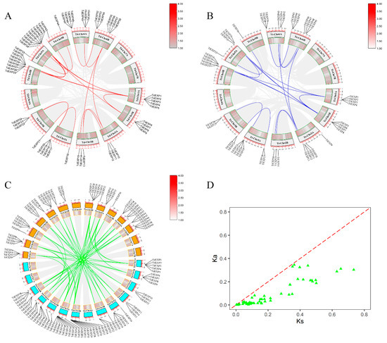 The syntenic relationship analyses of expansin gene family in wild emmer wheat and durum wheat. (A) Homologous genes in wild emmer wheat; (B) homologous genes in durum wheat; (C) homologous genes between wild emmer wheat and durum wheat; (D) Ka/Ks analysis between wild emmer wheat and durum wheat; green triangles show Ka/Ks values, red dotted lines show Ka/Ks = 1.