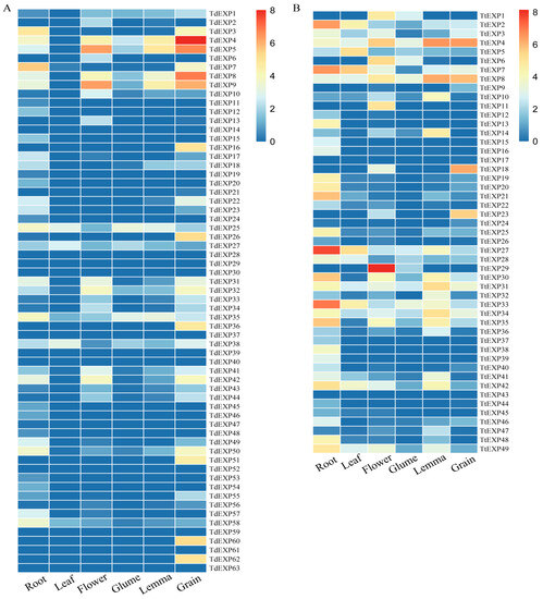 For constructing the expression of the expansin genes, we analyzed the expression levels of genes in different tissues (Table S7). As shown in Figure 8A, the majority of genes in WEW were expressed in different tissues, with relatively more numbers of genes expressed in root and grain. TdEXP4, TdEXP5, and TdEXP8 were comparatively more highly expressed in grain. TdEXP3 and TdEXP7 were relatively more expressed in the root. However, TdEXP14, TdEXP28, TdEXP29, TdEXP30, TdEXP37, TdEXP39, TdEXP40, TdEXP52, TdEXP59, TdEXP61, and TdEXP63 were unexpressed in any of the tissues. Although there were some genes that showed specific expression, TdEXP11, TdEXP12, TdEXP15, TdEXP19, TdEXP20, TdEXP24, TdEXP45, TdEXP46, TdEXP47, TdEXP48, TdEXP53, and TdEXP54 were only expressed in the root; this indicates that TdEXPs may have an essential role in the roots of WEW.