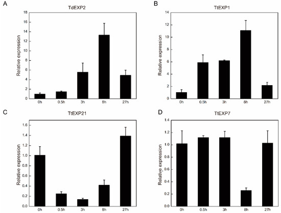 To identify the expansin family members involved in the salt response, we further selected one gene in wild emmer and three genes in durum to validate their expression by qRT-PCR analysis in different time nodes in salt treatment. Relative expression results of TdEXP2 and TtEXP1 were shown to upregulate the expression trend from 0 h to 8 h, yet the expression level sharply declined at 27 h (Figure 9A,B). Interestingly, the tendency of expression to decline and then rise was different from the other three in the TtEXP21 gene (Figure 9C). Ultimately, the relative expression results of TtEXP7 significantly decrease at 8 h (Figure 9D). The experiment results show that their expression responds to salt resistance.