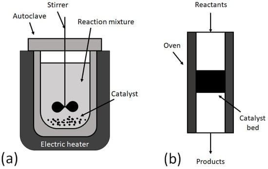 Most reactions of petrochemical and commodity chemical industries are heterogeneous catalytic processes, which have been studied in detail. Historically, the manufacturing of fine chemicals has been developed with batch technologies (Figure 1a) [1,2]. Mostly, this approach remains the main production technique in industries due to the high profit with low cost and flexibility of batch units to make multiple products. At the present moment, the synthesis of fine chemicals in continuous flow mode (Figure 1b) is an interesting challenge for researchers all over the world. On the other hand, developing flow processes can be time consuming.