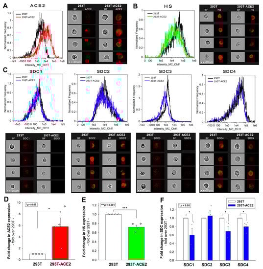 ACE2, HS, and SDC expression profiles of 293T and 293T-ACE2 cells. ACE2, HS, and SDC expression in 293T and 293T-ACE2 cells were assessed using fluorescently labeled specific antibodies with imaging flow cytometry. (A,B) ACE2 and HS expression profile of 293T and 293T-ACE2 cells. The representative flow cytometry histograms and cellular images show the ACE2 and HS expression of 293T and 293T-ACE2 cells treated with the fluorescent ACE2 and HS antibodies. Scale bar = 20 μm. (C) SDC expression profile of 293T and 293T-ACE2 cells. The representative flow cytometry histograms and fluorescent cellular images show the SDC expression of 293T cells and 293T-ACE2 cells treated with the APC-labeled respective SDC antibodies. Scale bar = 20 μm. (D–F) Detected ACE2, HS, and SDC expression values were normalized to those of 293T cells as standards. The bars represent the mean ± SEM of three independent experiments (data are represented as dots). Statistical significance vs. standards was assessed with ANOVA. * p < 0.05; *** p < 0.001.