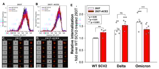 Cellular uptake of WT SCV2, Delta, and Omicron variants into 293T- and ACE2-overexpressing 293T-ACE2 cells. The cells were exposed to 1 MOI of heat-inactivated WT SCV2, Delta, and Omicron variants for 4 h at 37 °C. After incubation, the cells were washed, trypsinized, fixed, permeabilized, and treated with a primary SARS-CoV-2 spike (1000–1200 aa), followed by a fluorescently labeled (AF 633) secondary antibody. Cellular uptake was then analyzed with imaging flow cytometry. (A–D) Representative flow cytometry histograms and brightfield (BF) and fluorescent cellular images showing the intracellular fluorescence of the virus-exposed 293T and 293T-ACE2 cells. Scale bar = 20 μm. (E) Detected fluorescence intensities were normalized to WT SCV2-treated 293T cells as standards. The bars represent the mean + SEM of five independent experiments. Experimental data are presented as dots. Statistical significance was assessed with ANOVA. * p < 0.05; ** p < 0.01; *** p < 0.001; ns: not significant.