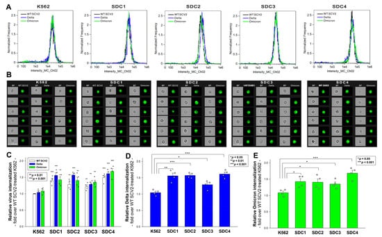 Cellular uptake of the heat-inactivated WT SCV2 and the Delta and Omicron variants into WT K562 cells and stable SDC transfectants. WT K562 cells and stable SDC transfectants were exposed to 1 MOI of the heat-inactivated WT SCV2 and the Delta and Omicron variants for 4 h at 37 °C. Cellular uptake was then analyzed with imaging flow cytometry using primary and fluorescently labeled secondary antibodies. (A,B) Representative flow cytometry histograms and cellular images showing the intracellular fluorescence of WT K562 cells and SDC transfectants treated with one of the viruses. Scale bar = 20 μm. (C–E) Detected fluorescence intensities normalized to WT SCV2-treated WT K562 cells as standards. The bars represent the mean + SEM of four independent experiments (data are represented as dots). Statistical significance vs. standards was assessed with ANOVA. * p < 0.05; ** p < 0.01; *** p < 0.001.