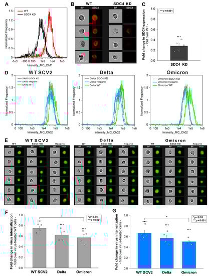 Effect of SDC4 knockdown (KD) or heparin inhibition on virus internalization into Calu-3 cells. SDC4 KD in Calu-3 cells was performed previously using a lentiviral vector specific to human SDC4. (A) SDC4 expression levels were measured with imaging flow cytometry, as shown by the representative histograms and cellular images. Detected SDC4 levels of KD cells were normalized to WT Calu-3 cells as standards. The bars represent the mean + SEM of four independent experiments. Statistical significance vs. standards was assessed with ANOVA. * p < 0.05. (B,C) SDC4 KD and WT Calu-3 cells were exposed to 1 MOI of the heat-inactivated WT SCV2, Delta, and Omicron variants. For GAG inhibition, the viruses were preincubated with heparin (200 ug/mL for 30 min at 37 °C) before being added to the cells. (D,E) Representative flow cytometry histograms and cellular images show the intracellular fluorescence of WT or SDC4 KD Calu-3 cells treated with the viruses in the presence or absence of heparin. Scale bar = 20 μm. (F,G) Detected intracellular fluorescent signals were normalized to WT Calu-3 (F) cells or cells untreated with heparin (G) as standards. The bars represent the mean + SEM of four independent experiments. Statistical significance vs. standards was assessed with ANOVA. * p < 0.05; *** p < 0.001.
