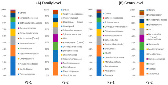 We performed bacterial composition analyses according to 16S rDNA sequences. PS-1 primarily consisted of the genus Geotoga (29.0%), Alkaliphilus transvaalensis (17.4%), genus Pseudomonas (13.6%), genus Marichromatium (10.6%), family Desulfovibrionaceae (10.1%), Acetobacteroides (Blvii28) (7.2%), Shewanella algae (7.1%), and genus Cohaesibacter (1.2%). PS-2 primarily consisted of A. transvaalensis (20.3%), Geotoga (18.7%), Acetobacteroides (Blvii28; 12%), family Ruminococcaceae (11.7%), Pseudomonas (10.4%), Marichromatium (7.8%), S. algae (6.1%), Desulfovibrio (5.7%), and Cohaesibacter (0.4%). Figure 2 shows the bacterial composition based on the family and the genus. Unknown genus names and non-isolated species are shown by family or order names.