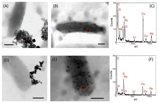 Transmission electron micrographs of PbS-forming bacteria (A,B,D,E) and the elemental compositions of the minerals (C,F). Scale bar: 500 nm. Circles in (B) and (E) indicate areas where the electron beam was applied for EDS.