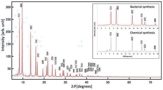 XRD patterns are unique because they depend on the arrangements of atoms and molecules within a given material. XRD analysis can be used to determine the lattice constants associated with the components of a given material. The XRD pattern of a thin layer of bacterial PbS indicated polycrystals with faces corresponding to PbS (111), (200), (220), and (311) (Figure 5). RCVBN medium contains several mineral ions, such as Mg2+, Fe2+, Mn2+, MoO42−, Zn2+, and Cu2+, as trace elements. Similar to biomolecules, the presence of these metal compounds could also introduce impurities in PbS nanoparticles. Therefore, the purity of the PbS nanoparticles was confirmed using synchrotron-source XRD. In Figure 5, the diffraction pattern from bacterial PbS nanoparticles (Figure 5, red-color chart) shows good agreement with theoretical peaks of PbS, suggesting that there are no impurities in the bacterial PbS nanoparticles. The diffraction pattern (2θ = 25°, 30°, 43°, 40°, 53°, 62°, and 68°) matched that of galena (cubic system).
