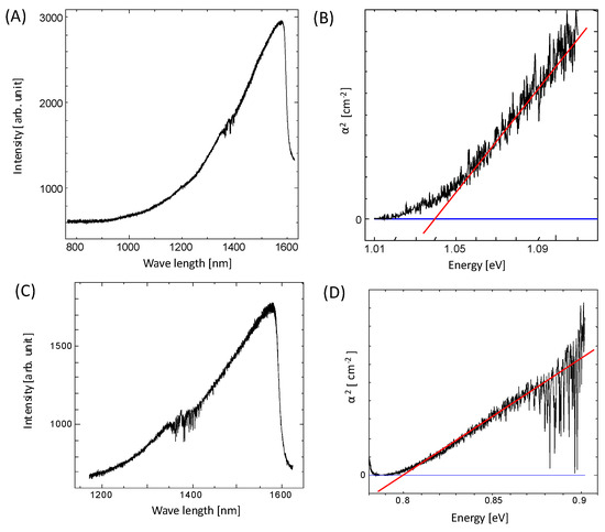 The absorption coefficient, α, and the light energy were calculated using Equations (3) and (4), and the relationship between α2 and the light energy was plotted. Here, actual thickness of PbS cannot be measured; therefore, the calculated values of α2 were not indicated on the y-axis. Eg was determined graphically by taking the point where the tangent at the highest slope of the plot intersected with the background.