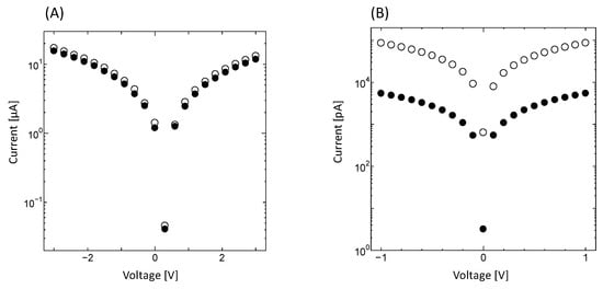 Current–voltage measurements of illuminated (A) bacterial PbS nanoparticles and (B) InP substrate. Open circle: with illumination, closed circle: without illumination. Voltages for PbS and InP were applied at ±3 V and ±1 V, respectively.