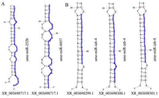 Stem–loop structures of lncRNAs served as potential miRNA precursors. (A) XR_003698717.1, the potential precursor for both ame-mir-252b and ame-mir-6057; (B) ame-miR-iab-4, the potential generated from XR_003698299.1, XR_003698300.1, and XR_00369830.1. The nucleotides in purple represent the mature sequences of these five miRNAs.
