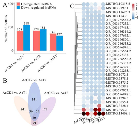 By using the edgeR software (http://www.bioconductor.org/ version 4.2) (accessed on 11 March 2023) [70], the DElncRNAs in the AcCK1 vs. AcT1, AcCK2 vs. AcT2, and AcCK3 vs. AcT3 comparison groups were screened following the criteria of p ≤ 0.05 (corrected by false discovery rate) and |log2(FC)| ≥ 1. Subsequently, the Venn diagram analysis and expression clustering of the DElncRNAs were carried out with corresponding tools in the OmicShare platform (https://www.omicshare.com/tools/Home/Soft/venn (accessed on 11 March 2023)).
