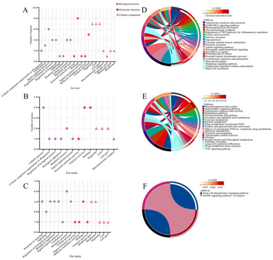 It has been shown that an emerging class of lncRNAs control the expression of neighboring protein-coding genes via a cis-acting effect [71]. On the basis of the genomic colocalizations of DElncRNAs, protein-coding genes located 10 kb up- and down-stream of DElncRNAs were surveyed, which were then annotated to the GO (http://www.geneontology.org/ (accessed on 11 March 2023)) and KEGG (https://www.kegg.jp/ (accessed on 11 March 2023)) databases by the Blast tool, respectively, to yield functional terms and pathways.