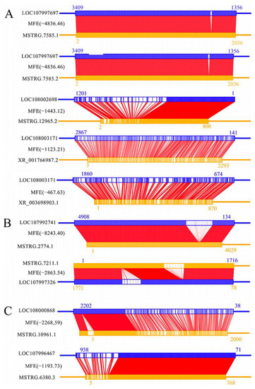 Binding relationships between nine antisense DElncRNAs and corresponding sense-strand mRNAs. (A) Two known (XR_001766987.2, XR_003698903.1) and three novel lncRNAs (MSTRG.7585.1, MSTRG.7585.2, MSTRG.12965.2) as potential antisense lncRNAs in the 4-day-old comparison group; (B) Two novel lncRNAs (MSTRG.2774.1, MSTRG.7211.1) as potential antisense lncRNAs in the 5-day-old comparison group; (C) Two novel lncRNAs (MSTRG.10961.1, MSTRG.10961.2) as potential antisense lncRNAs in the 6-day-old comparison group.