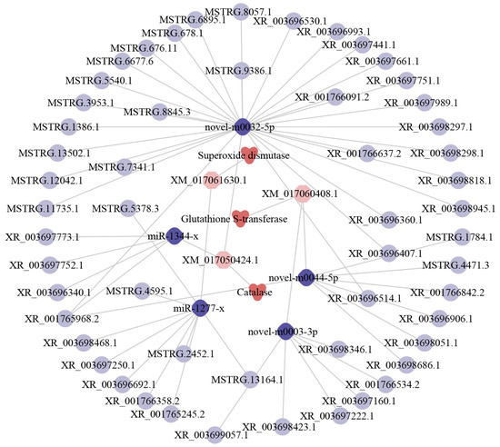 Further analyses suggested that 56 DElncRNAs could target five DEmiRNAs and further target three DEmRNAs shared by the three comparison groups, forming a complex regulatory network relevant to antioxidant enzymes (Figure 6). In detail, nine DElncRNAs could target miR-1277-x, further targeting one DEmRNA encoding superoxide dismutases (SOD); 34 DElncRNAs could target two miRNAs (miR-1344-x and novel-m0032-5p) and further target one DEmRNA encoding catalases (CAT); 13 DElncRNAs could target two DEmiRNAs (novel-m0044-5p and novel-m0003-3p) and further bind to one glutathione S-transferase (GST)-encoding DEmRNA.