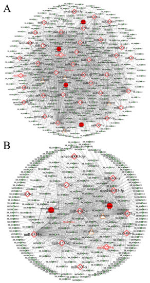 DElncRNA-involved ceRNA sub-network relative to cellular (A) and humoral (B) immune response in the A. c. cerana 4-day-old larval gut. Red diamonds represent miRNAs, green circles represent lncRNAs, orange triangles represent mRNAs, and red hexagons represent proteins.