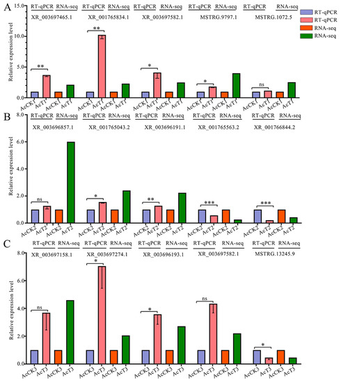 To verify the reliability of the transcriptome data used in this work, five DElncRNAs from each of three comparison groups mentioned above were randomly chosen for RT-qPCR detection. The five DElncRNAs from the AcCK1 vs. AcT1 comparison groups were XR_003697465.1, XR_001765834.2, XR_003697582.1, MSTRG.9797.1, and MSTRG.1072.5; the five DElncRNAs from the AcCK2 vs. AcT2 comparison group were XR_003696857.1, XR_001765043.2, XR_003696191.1, XR_001765563.2, and XR_001766844.2; the five DElncRNAs from the AcCK3 vs. AcT3 comparison groups were XR_003697158.1, XR_003697274.1, XR_003696193.1, XR_003697582.1, and MSTRG.13245.9. Specific primers (Table S1) for these 15 DElncRNAs were designed with Primer Premier 6 [81], and then synthesized by Sangon Biotech (Shanghai) Co., Ltd., Shanghai, China. The actin gene (GenBank accession number: XM_017059068.2) was used as an internal reference. Total RNA from the gut tissues of A. apis-inoculated and un-inoculated 4-, 5-, and 6-day-old larvae (n = 3) was respectively isolated using the RNA extraction kit (Promega, Madison, WI, USA). The resulting cDNAs (Yeasen, Shanghai, China) were used as templates for qPCR reactions, which were performed under the following conditions: 95 °C pre-denaturation for 3 min; 95 °C denaturation for 15 s, 56 °C annealing for 30 s and extension for 20 s, for a total of 40 cycles. The reaction system (20 μL) contained 1 μL of cDNA, 10 μL of qPCR, 1 μL of upstream and downstream primers (2.5 μmol/L), and 7 μL of DEPC water. Each reaction was performed with at least three samples in parallel and was repeated three times. The relative expression level of each DElncRNA was calculated by the 2−∆∆CT method [82]. GraphPad Prism 8.0 software was used for data analysis and plotting. Data are shown as mean ± standard deviation (SD) and were subjected to Student’s t-test, ns: p > 0.05, *: p < 0.05, **: p < 0.01, ***: p < 0.001, ****: p < 0.0001).