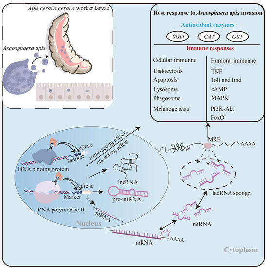 A hypothetical working model of the DElncRNA-modulated responses of A. c. cerana worker larvae to A. apis invasion.